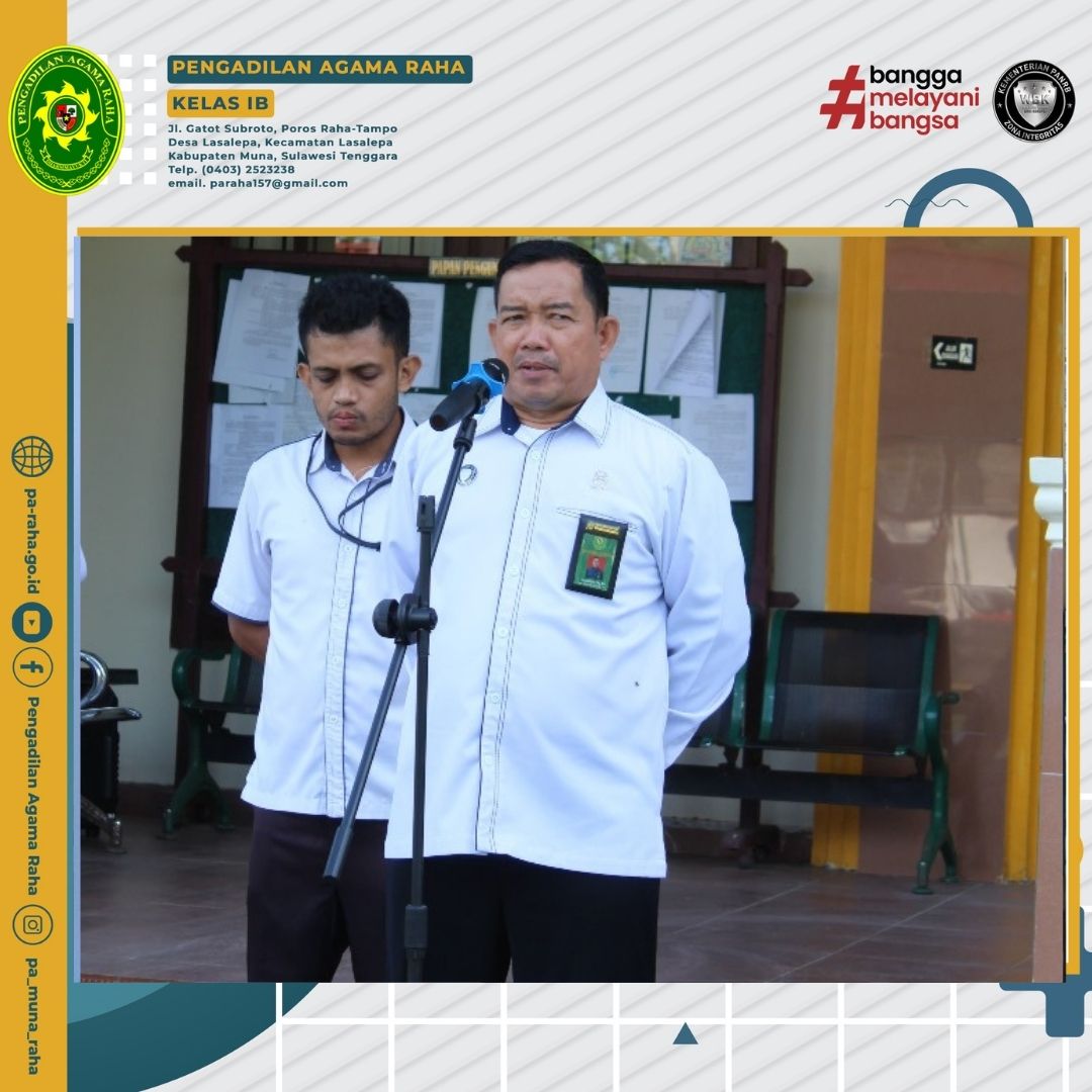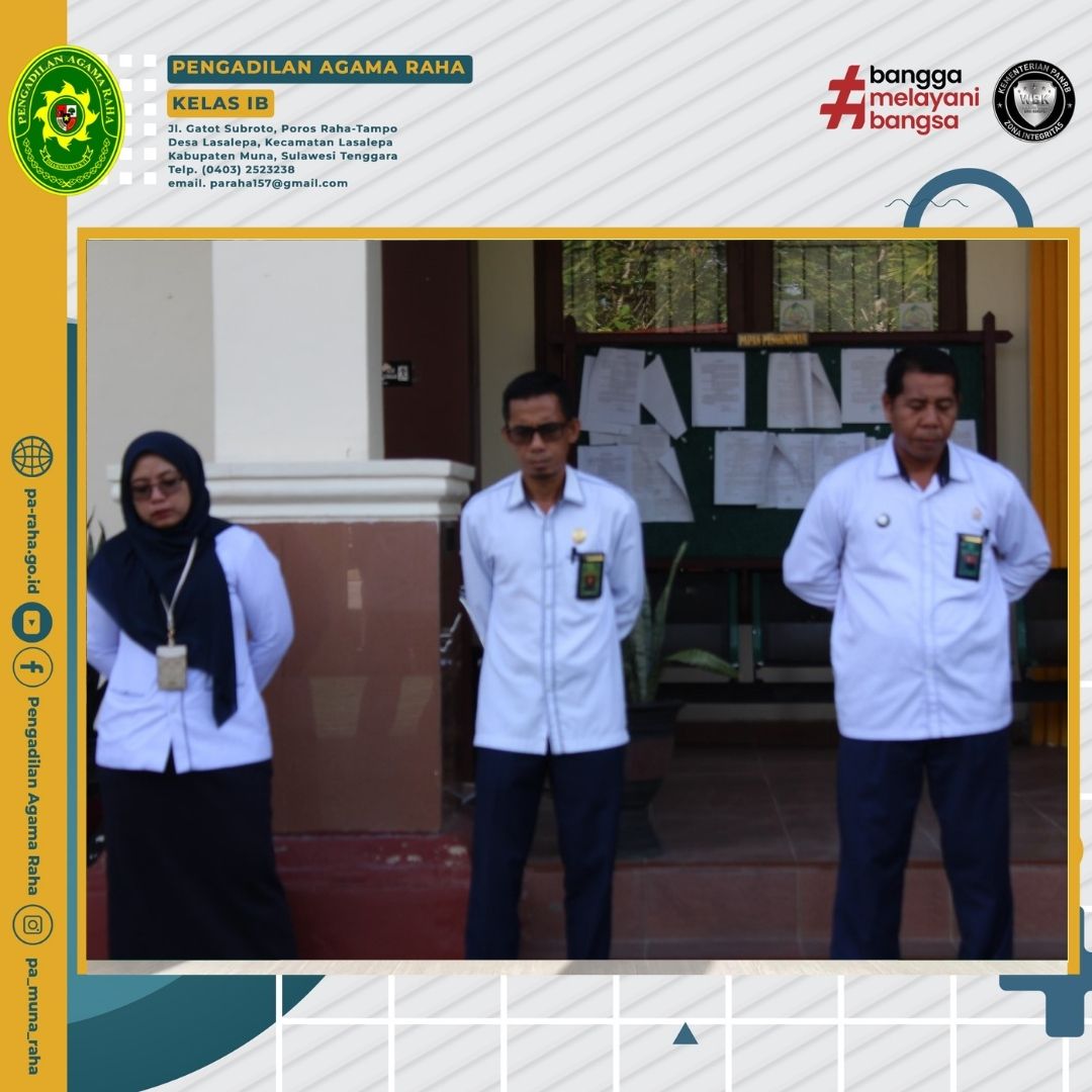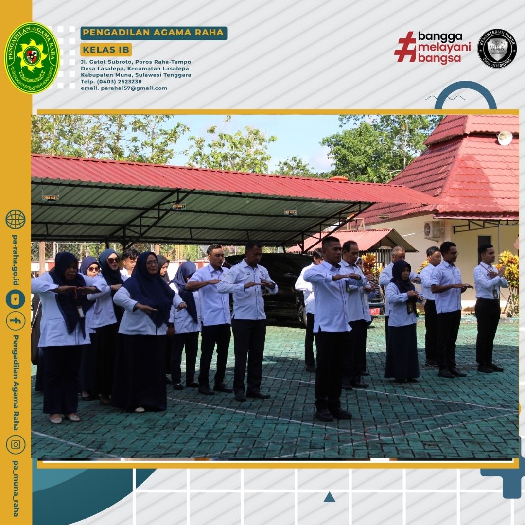 Pengadilan Agama Raha kembali melaksanakan apel rutin hari senin pagi yang berlangsung dihalaman kantor dengan penuh hikamd. Bertindak sebagai pembina apel yaitu Wakil Ketua Pengadilan Agama Raha, Naharuddin, S.Ag.M.H. dan diikuti oleh pimpinan para Hakim, pejabat struktural, fungsional dan seluruh aparatur Pengadilan Agama Raha.