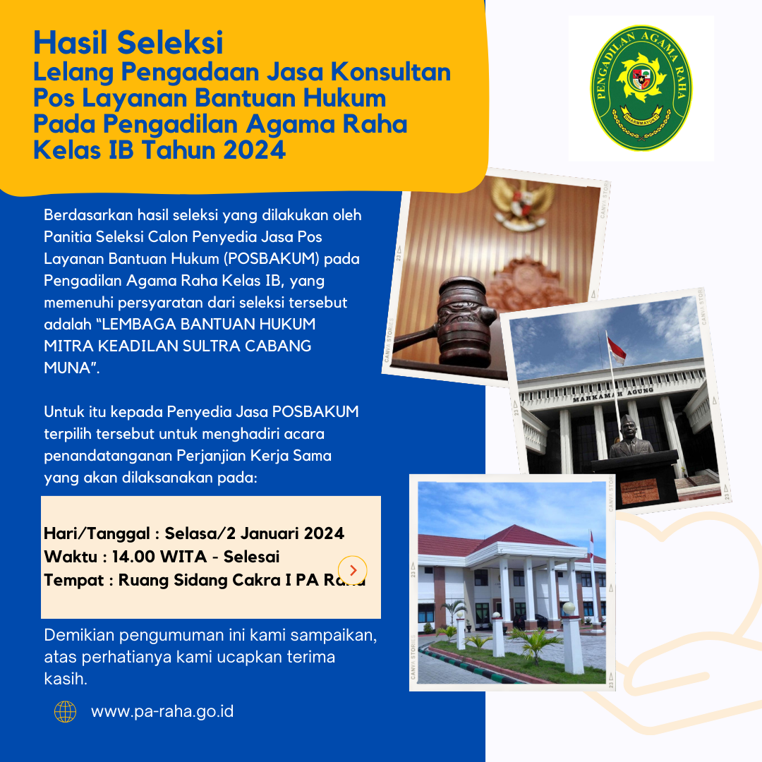 PENGUMUMAN SELEKSI PENGADAAN JASA KONSULTASI POS BANTUAN HUKUM (POSBAKUM) Written by Super User on 13 December 2023. Written by Super User on 13 December 2023. Hits: 495 PENGUMUMAN HASIL SELEKSI PENGADAAN JASA KONSULTAN POS LAYANAN BANTUAN HUKUM (POSBAKUM) PADA PENGADILAN AGAMA RAHA KELAS 1B TAHUN 2024