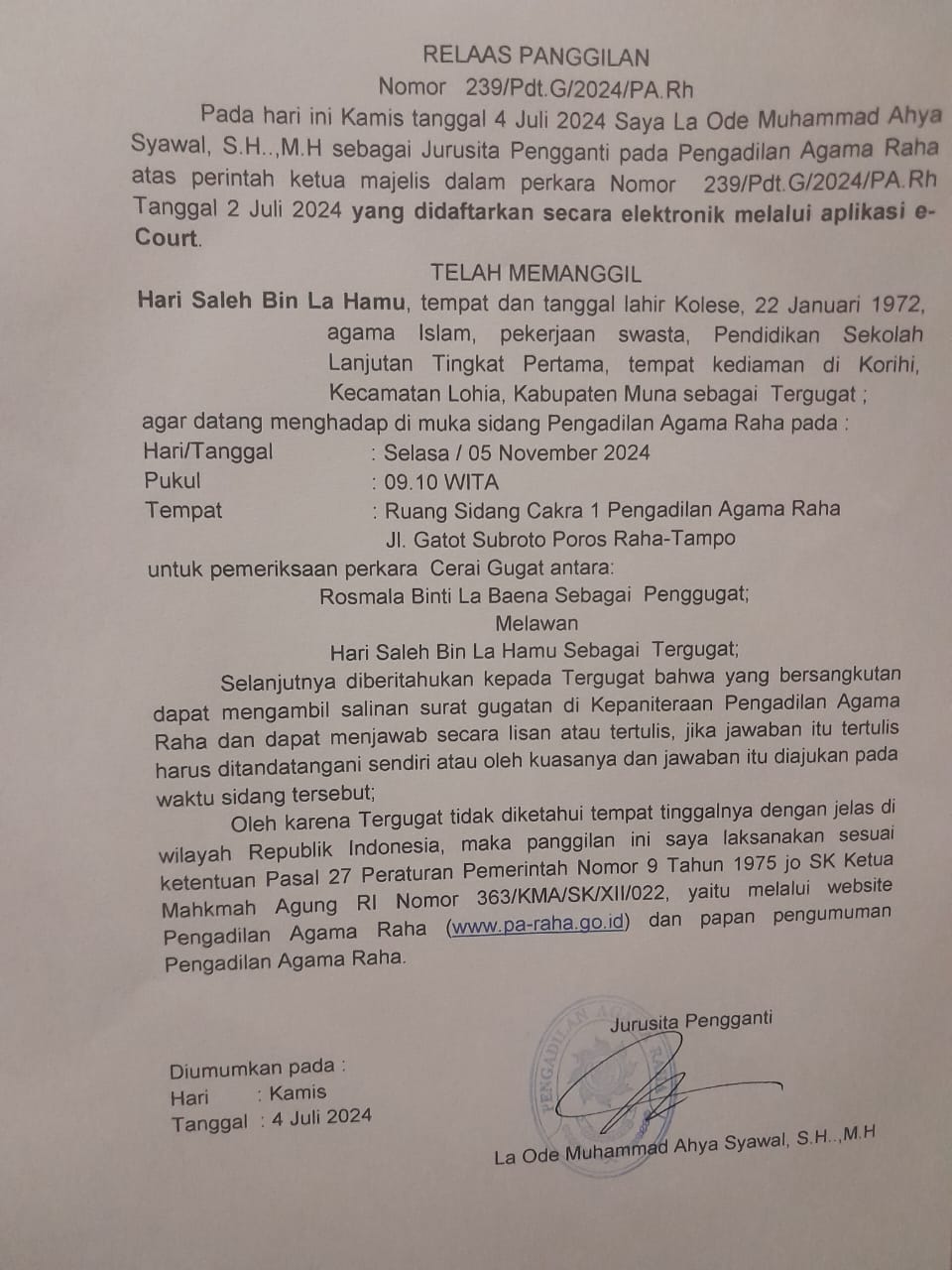 Panggilan Sidang Terguat an. Hari Saleh bin La Hamu Written by Super User on 04 July 2024. Written by Super User on 04 July 2024. Hits: 178