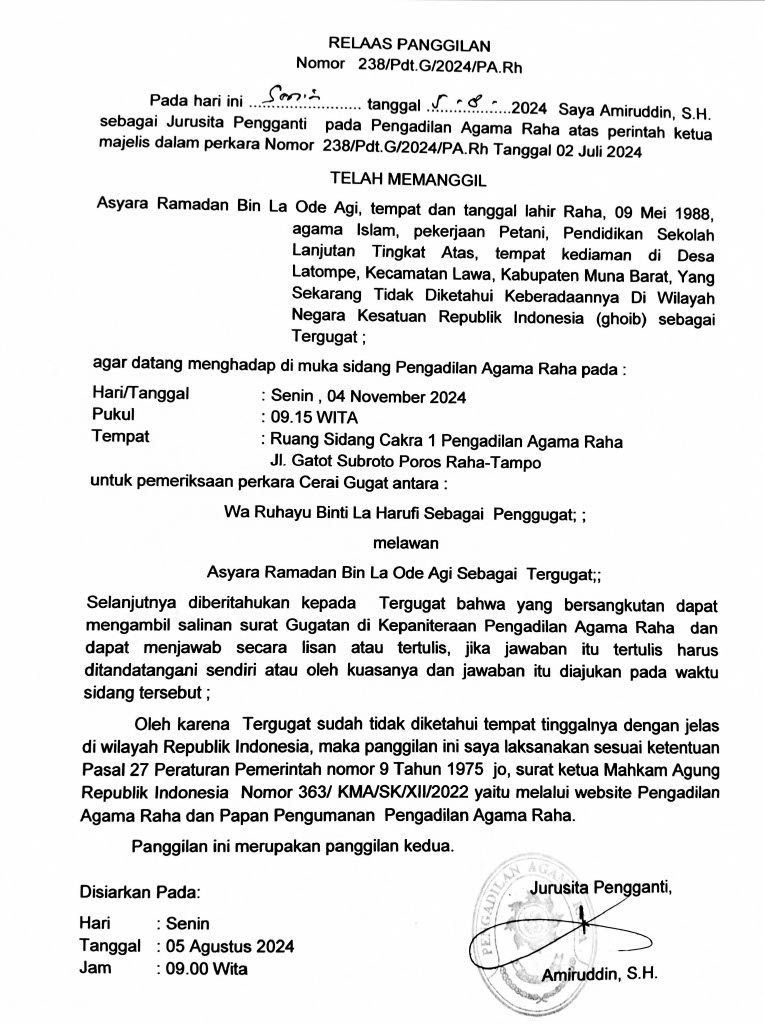 Panggilan Sidang Terguat an. Asyara Ramadan bin La Ode Agi, Perkara Nomor 238/Pdt.G/2024/PA Rh Written by Super User on 05 August 2024. Written by Super User on 05 August 2024. Hits: 70