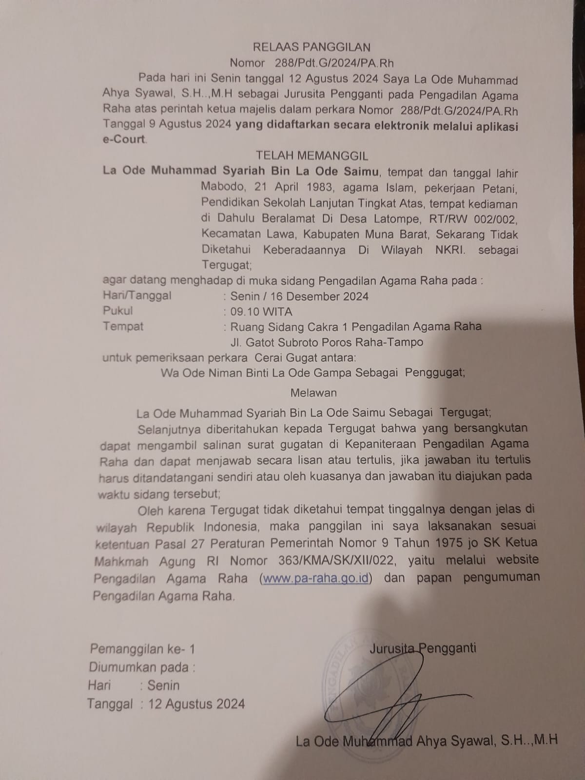 Panggilan Sidang Terguat an. La Ode Muhammad Syariah Bin La Ode Saimu perkara Nomor : 288/Pdt.G/2024/PA.Rh Written by Super User on 12 August 2024. Written by Super User on 12 August 2024. Hits: 132