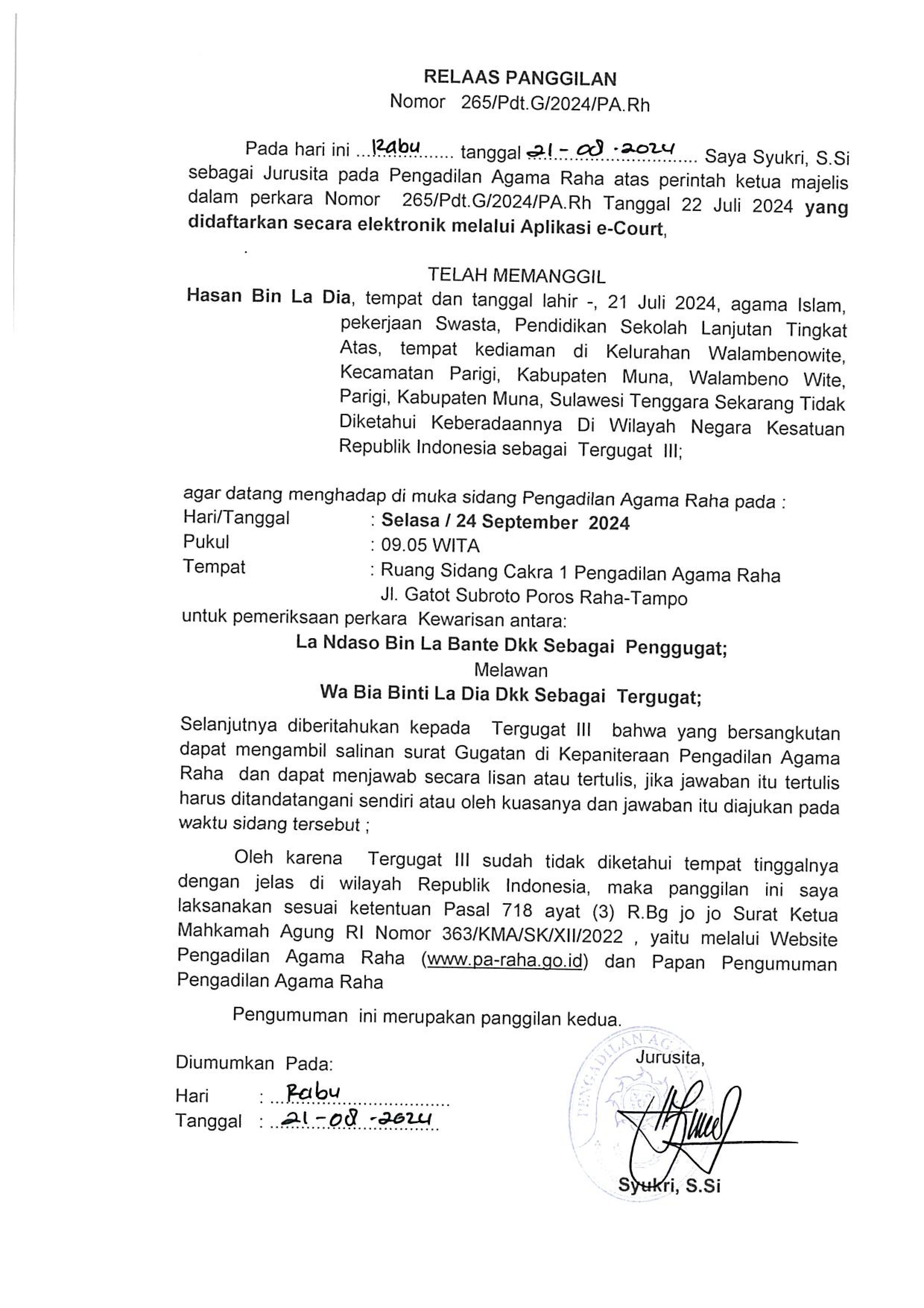 Panggilan ke-2 Perkara Nomor 265/Pdt.G/2024/PA.Rh, an. Hasan bin La Dia Written by Super User on 21 August 2024. Written by Super User on 21 August 2024. Hits: 193