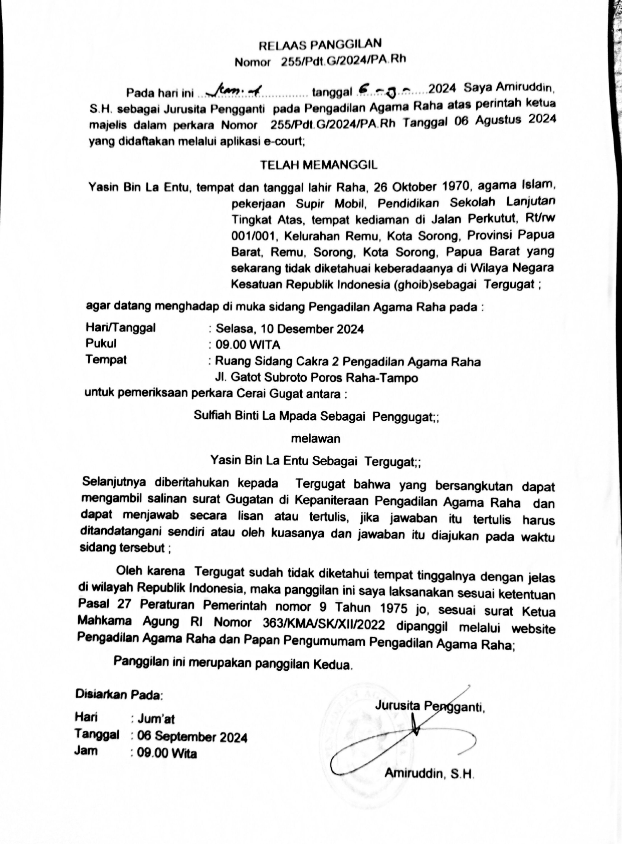Panggilan Sidang kedua Terguat an. Yasin bin La Entu perkara nomor 255/Pdt.G/2024/PA Rh Written by Super User on 06 September 2024. Written by Super User on 06 September 2024. Hits: 128