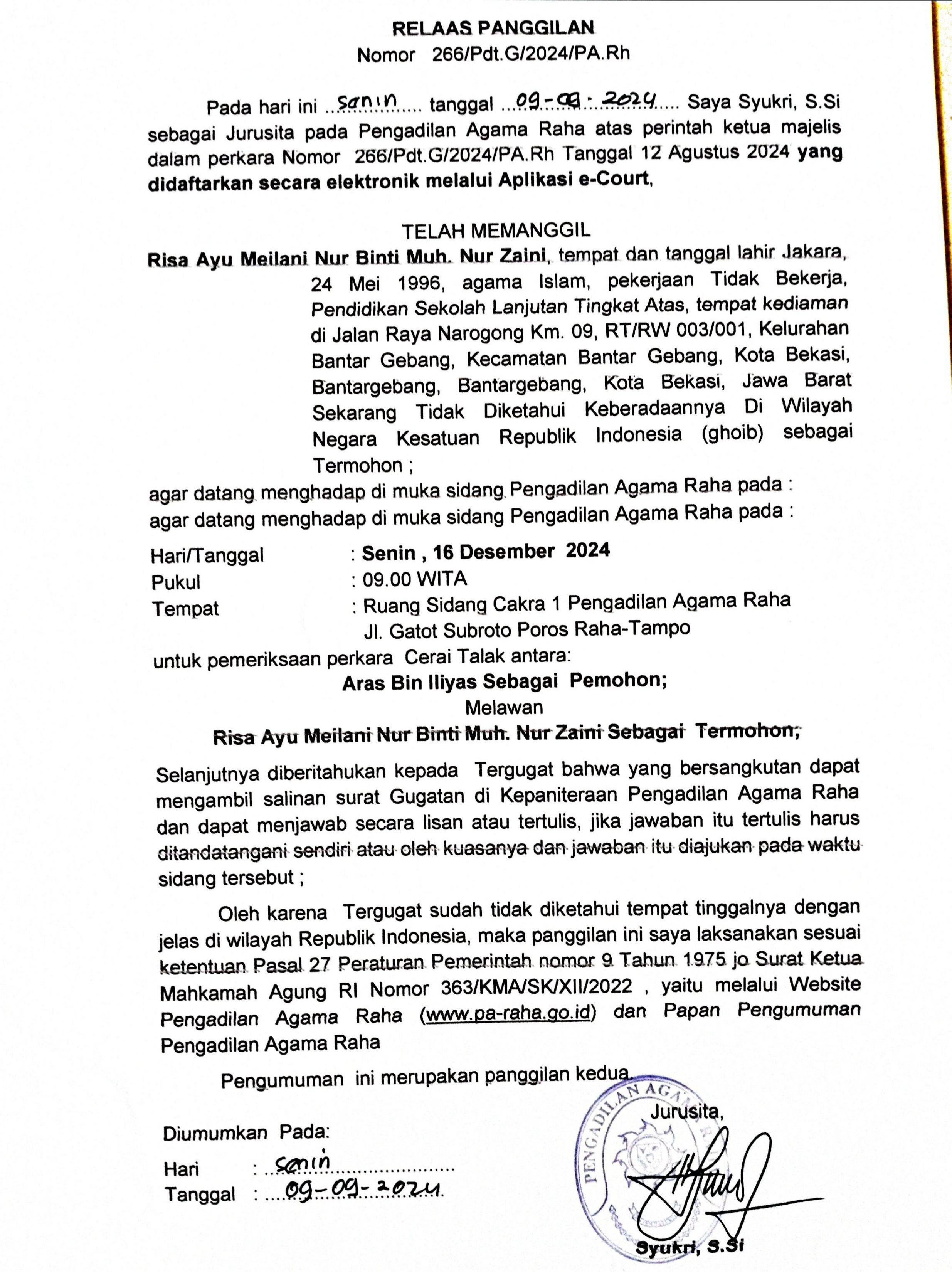 Panggilan Sidang Kedua Tergugat an. Risa Ayu Meilani Nur binti Muh. Nur Zaini perkara Nomor 266/Pdt.G/2024/ PA Rh Written by Super User on 10 September 2024. Written by Super User on 10 September 2024. Hits: 168