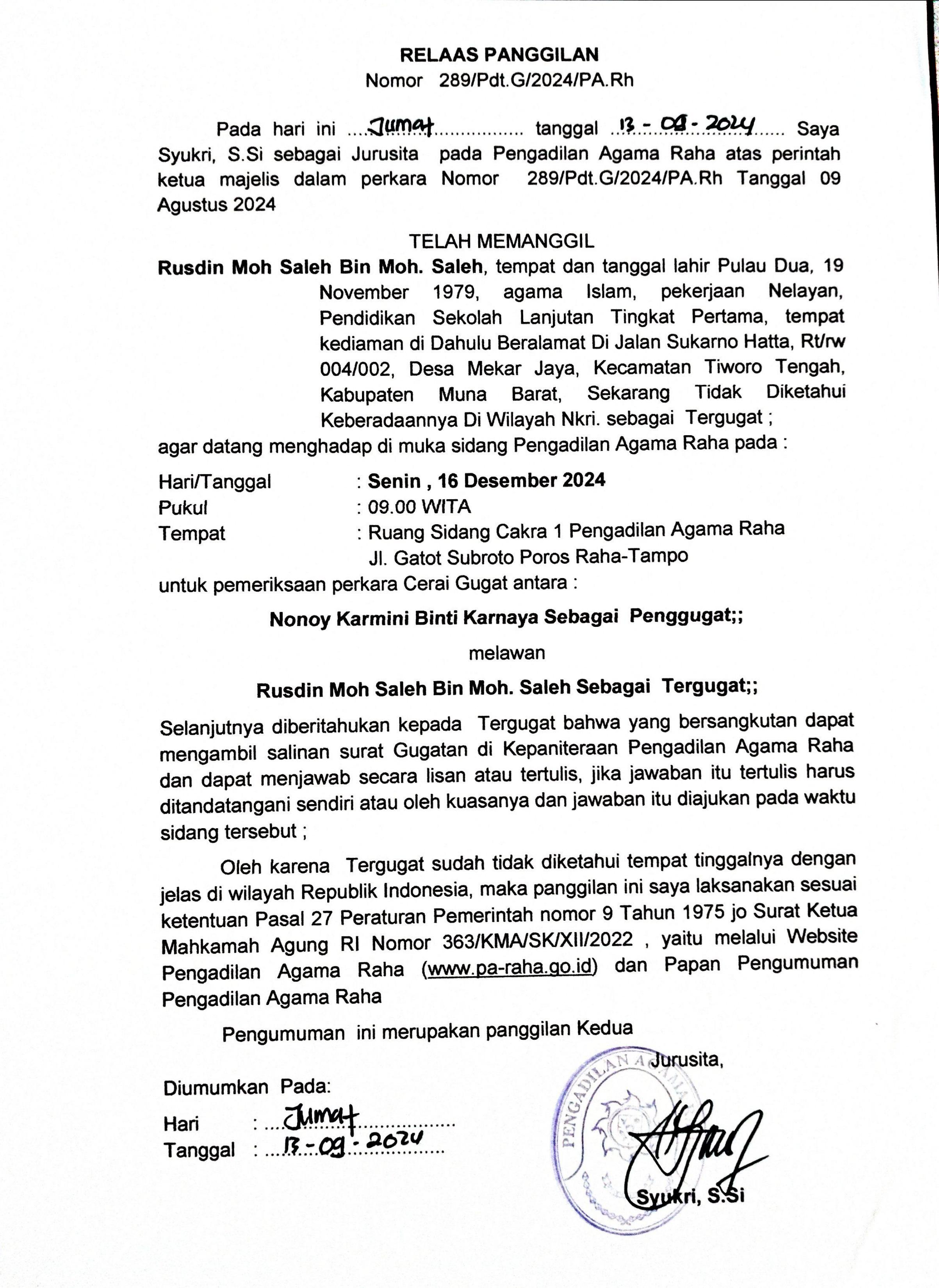 Panggilan Sidang Kedua Terguat an. Rusdin Moh Saleh bin Moh. Saleh perkara Nomor 289/Pdt.G/2024/PA Rh Written by Super User on 13 September 2024. Written by Super User on 13 September 2024. Hits: 164