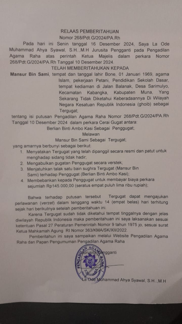 Pemberitahuan Putusan Nomor 268/Pdt.G/2024/PA Rh an. Mansur bin Sami Written by Super User on 16 December 2024. Written by Super User on 16 December 2024. Hits: 82