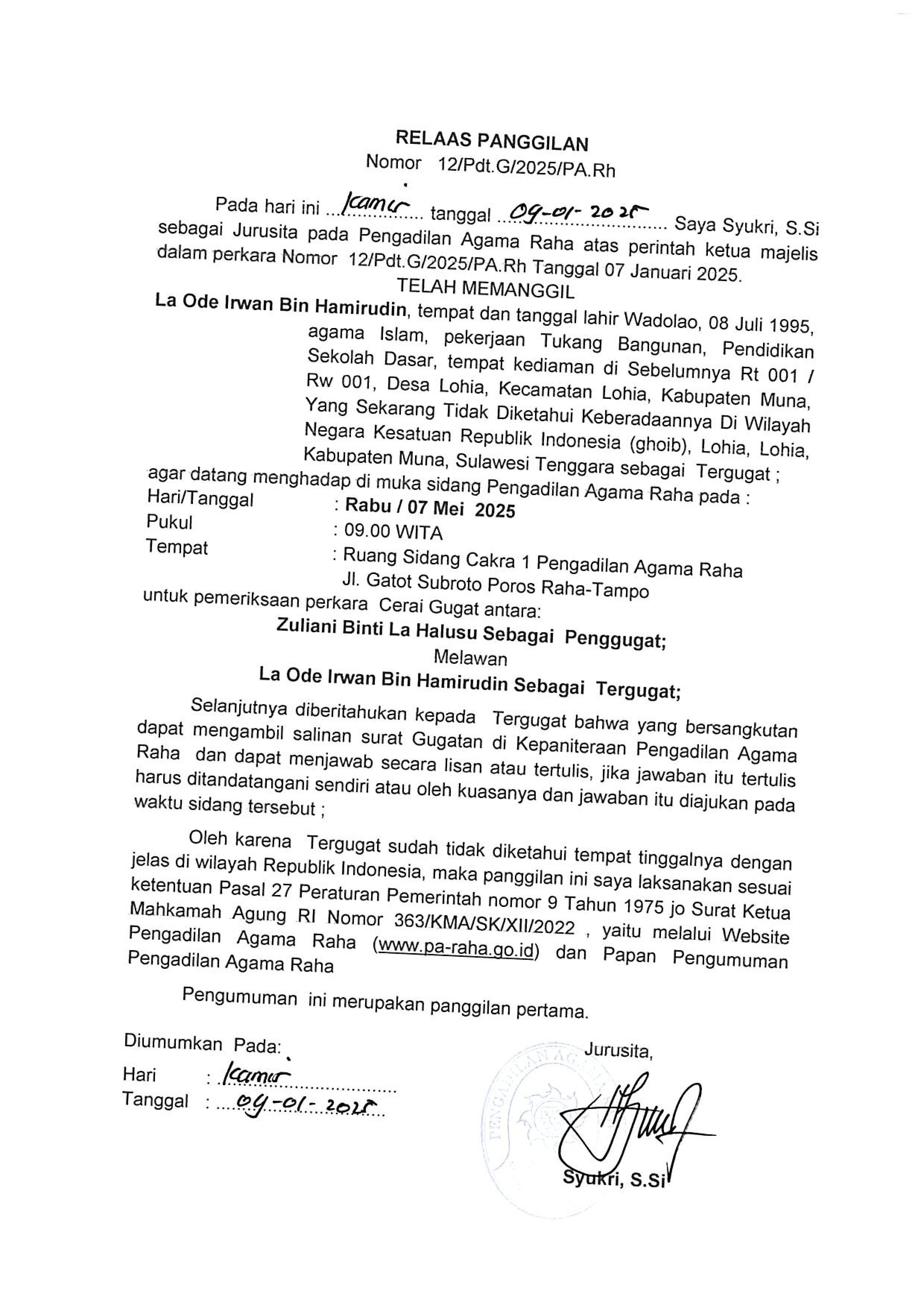PANGGILAN GHAIB NO. 12/Pdt.G/2025/PA. Rh. a.n. LA ODE IRWAN BIN HAMIRUDIN Written by Super User on 08 January 2025. Written by Super User on 08 January 2025. Hits: 144 Panggilan Tergugat LA ODE IRWAN BIN HAMIRUDIN yang saat ini tidak diketahui alamatnya dengan nomor perkara 12/Pdt.G/2025/PA.Rh