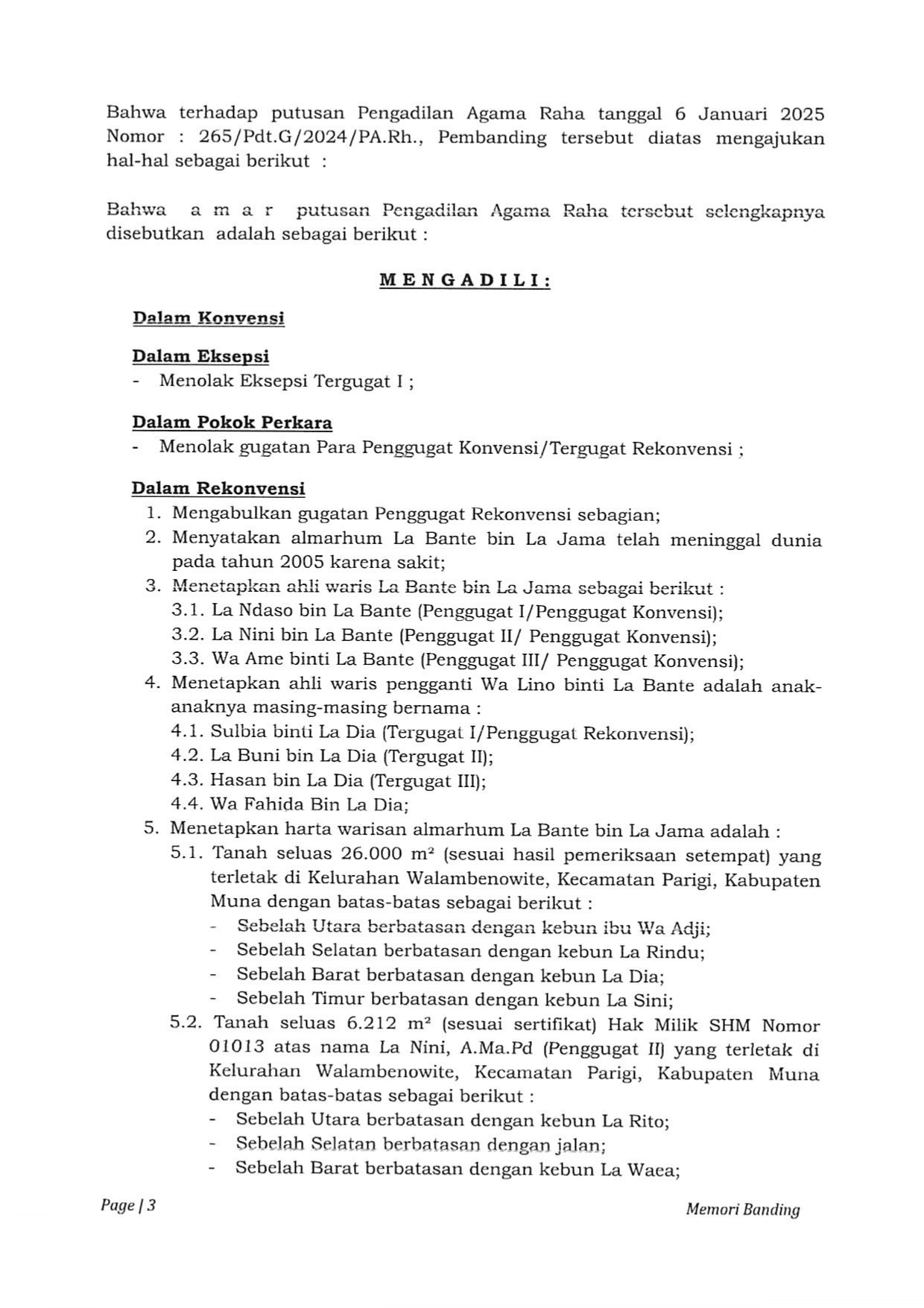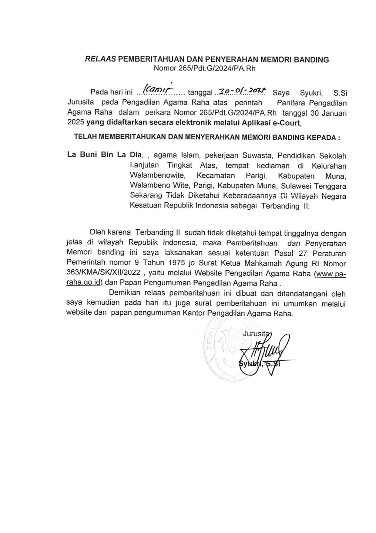 PEMBERITAHUAN DAN PENYERAHAN MEMORI BANDING NOMOR 265/Pdt.G/2024/PA Rh Written by Super User on 30 January 2025. Written by Super User on 30 January 2025. Hits: 195