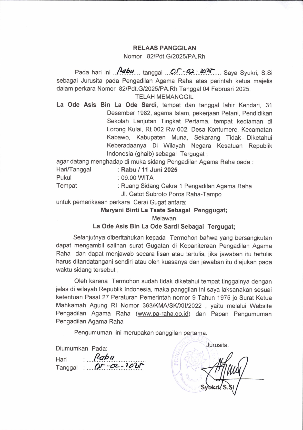 Panggilan Pertama Perkara Gaib Nomor 82/Pdt.G/2025/PA.Rh an. La Ode Asis bin La Ode Sardi Written by Super User on 06 February 2025. Written by Super User on 06 February 2025. Hits: 104