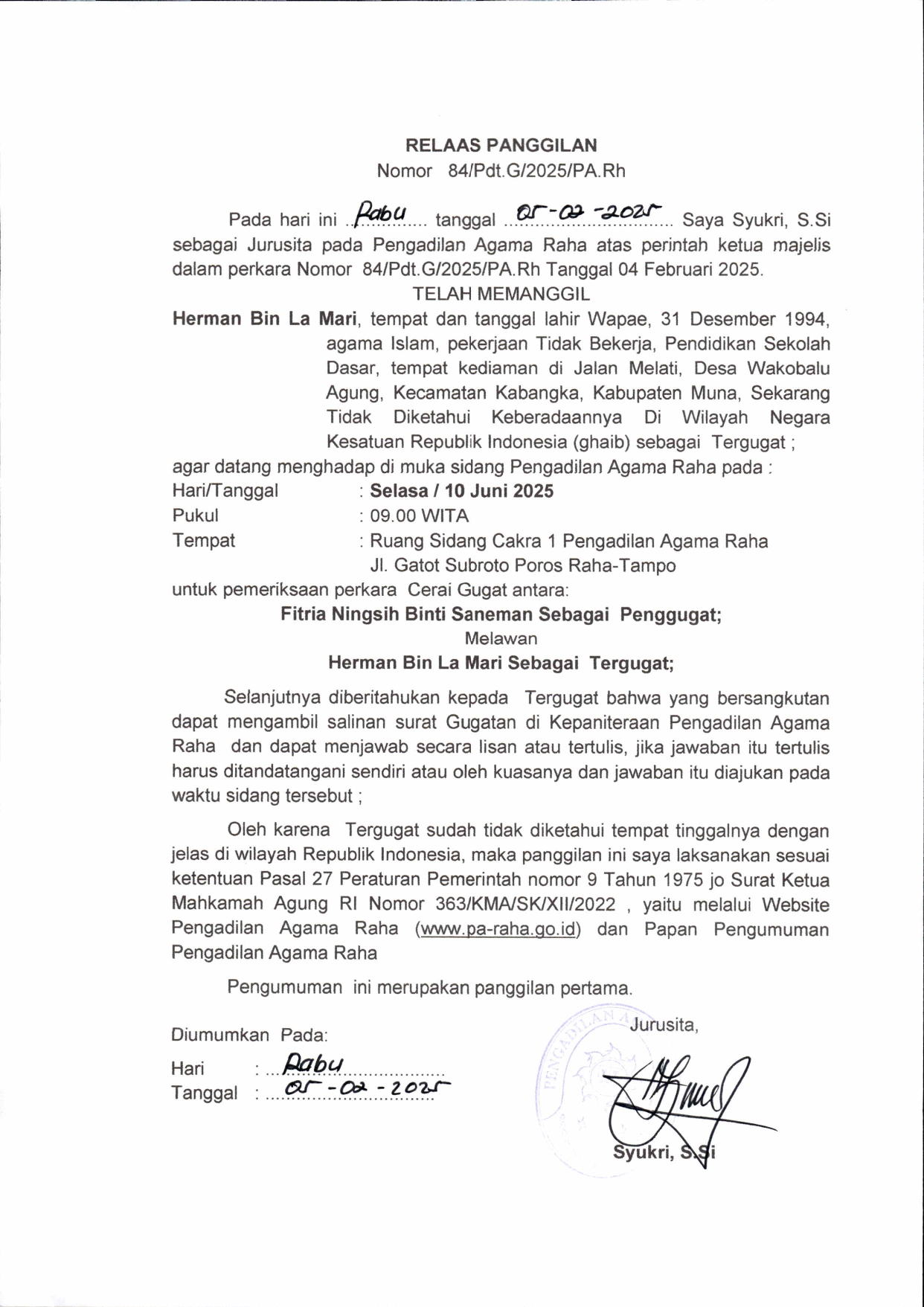 Panggilan Sidang Perkara Gaib Nomor 84/Pdt.G/2025/PA. Rh an. Herman bin La Mari Written by Super User on 06 February 2025. Written by Super User on 06 February 2025. Hits: 110