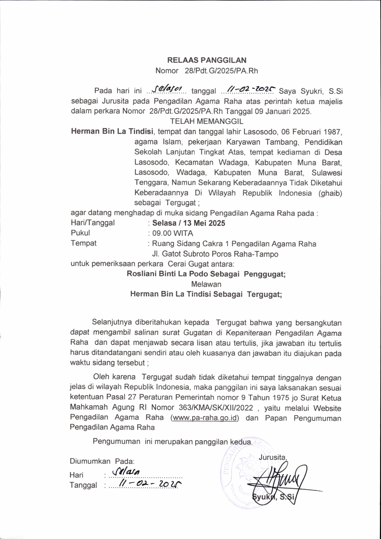 Panggilan Sidang ke 2 Perkara Gaib Nomor : 28/Pdt.G/2025/PA. Rh, an. Herman bin La Tindisi Written by Super User on 11 February 2025. Written by Super User on 11 February 2025. Hits: 167