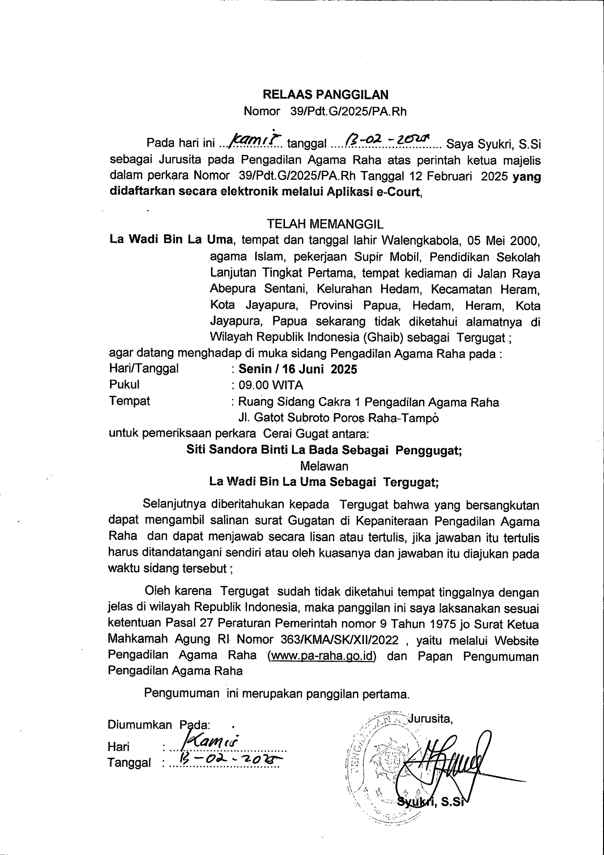 Panggilan Sidang Terguat an. La Wadi bin La Uma Perkara Nomor 238/Pdt.G/2024/PA Rh Written by Super User on 14 February 2025. Written by Super User on 14 February 2025. Hits: 95