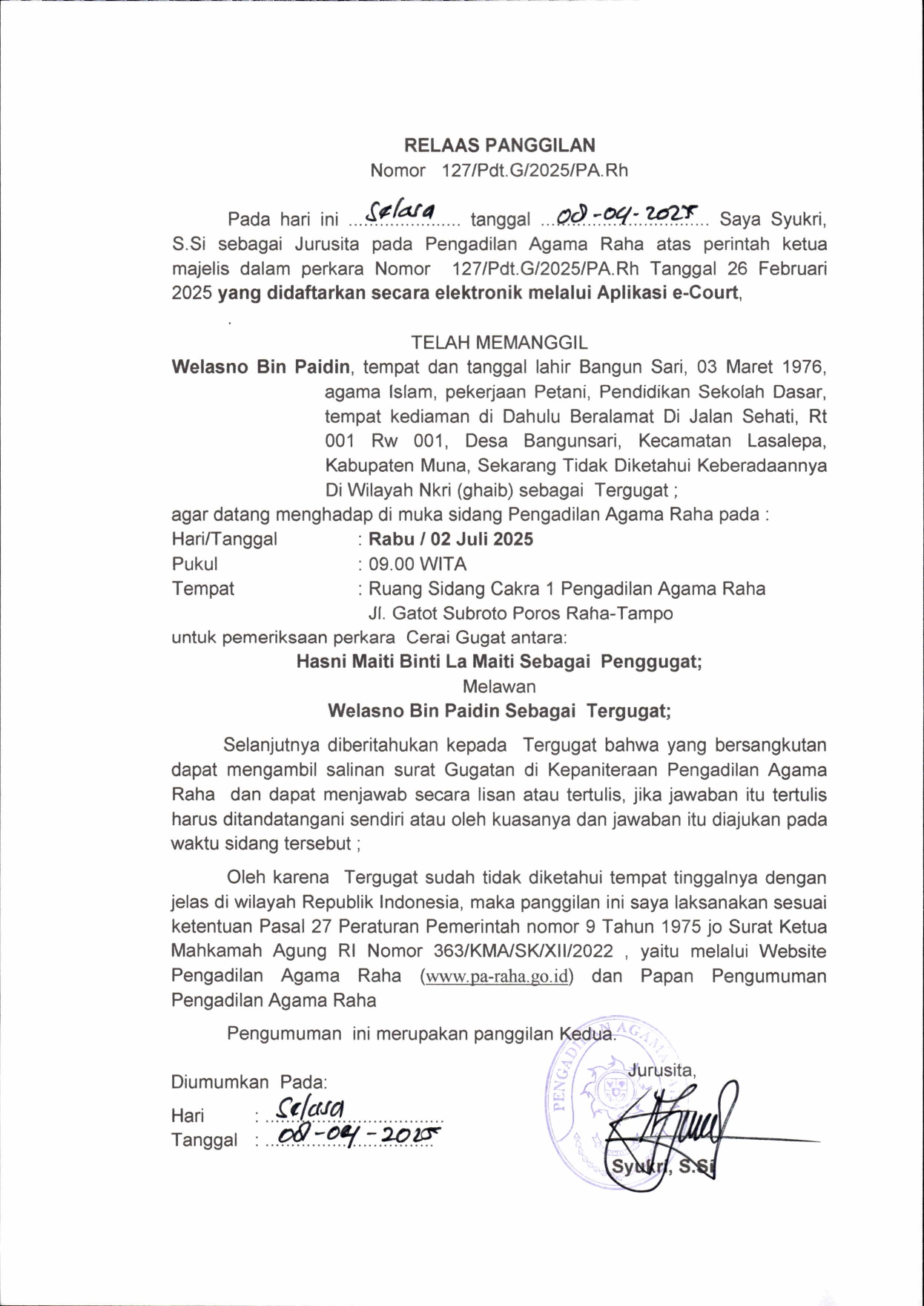 Panggilan ke-2 Perkara Nomor 127/Pdt.G/2025/PA.Rh, an. Walesno bin Paidin Written by Super User on 09 April 2025. Written by Super User on 09 April 2025. Hits: 89