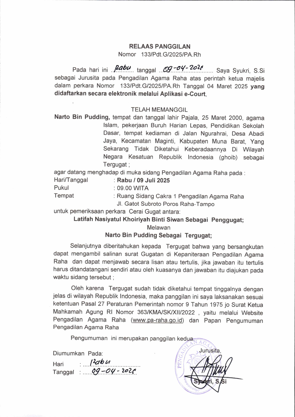 Panggilan Sidang Ke-2 an. Narto bin Puding (Perkara Nomor : 133/Pdt.G/2025/PA.Rh) Written by Super User on 10 April 2025. Written by Super User on 10 April 2025. Hits: 63
