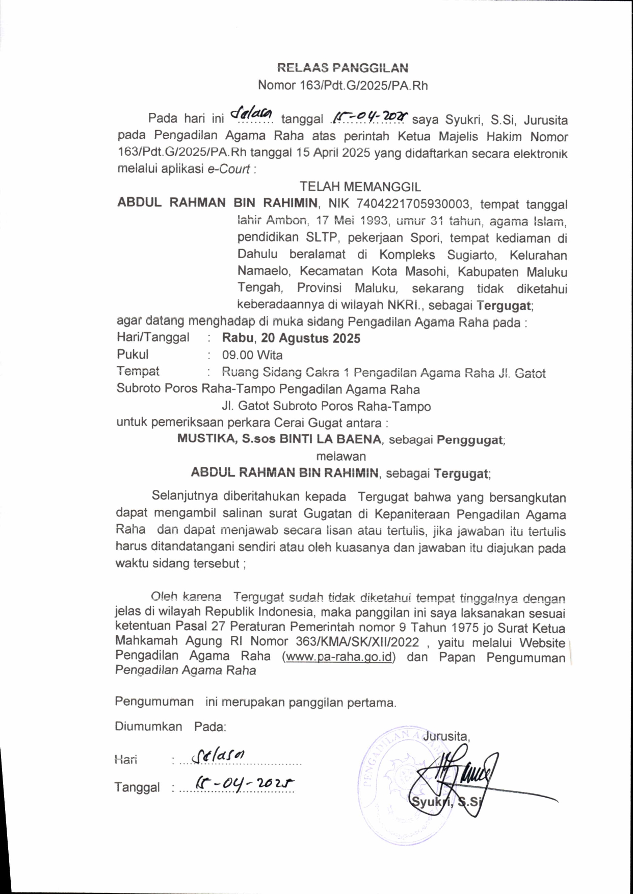 Panggilan Sidang Pertama Perkara Gaib Nomor 163/Pdt.G/2025/PA. Rh, an. Abdul Rahman bin Rahimin Written by Super User on 15 April 2025. Written by Super User on 15 April 2025. Hits: 68