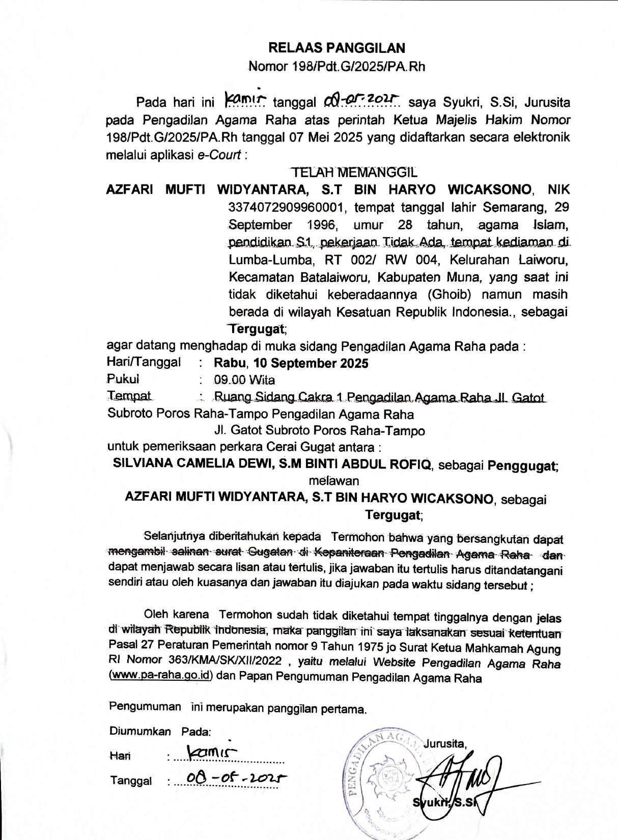 Home > Informasi Pengadilan > Panggilan Sidang Pertama Terguat an. Azfari Mufti Widyantara, S.T bin Haryo Wicaksono perkara Nomor : 198/Pdt.G/2025/PA.Rh
