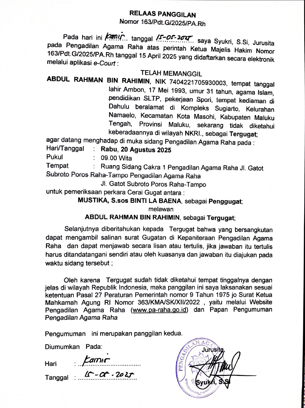 Panggilan Sidang ke 2 Perkara Gaib Nomor : 163/Pdt.G/2025/PA. Rh, an. Abdul Rahman bin Rahimin Written by Super User on 15 May 2025. Written by Super User on 15 May 2025. Hits: 38