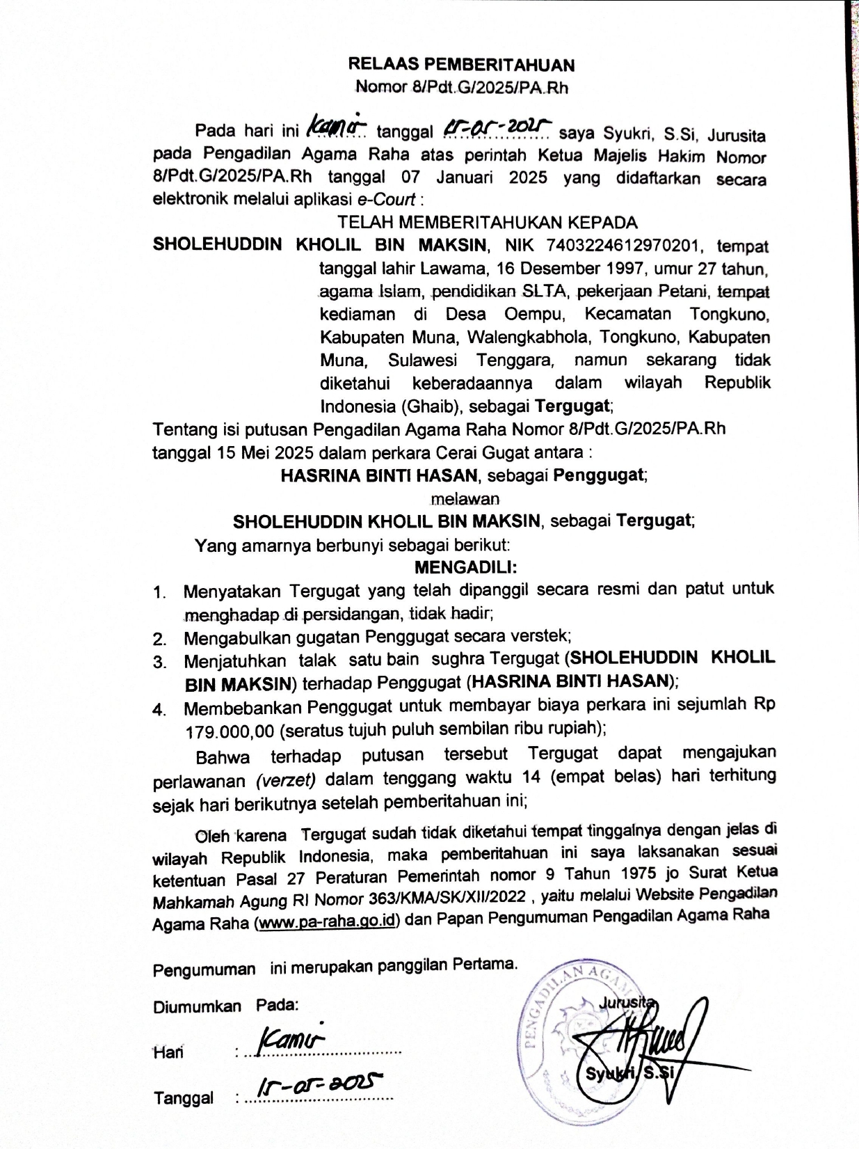 Pemberitahuan Putusan Nomor 8/Pdt.G/2025/PA Rh an. Sholehuddin Kholil bin Maksin Written by Super User on 15 May 2025. Written by Super User on 15 May 2025. Hits: 48
