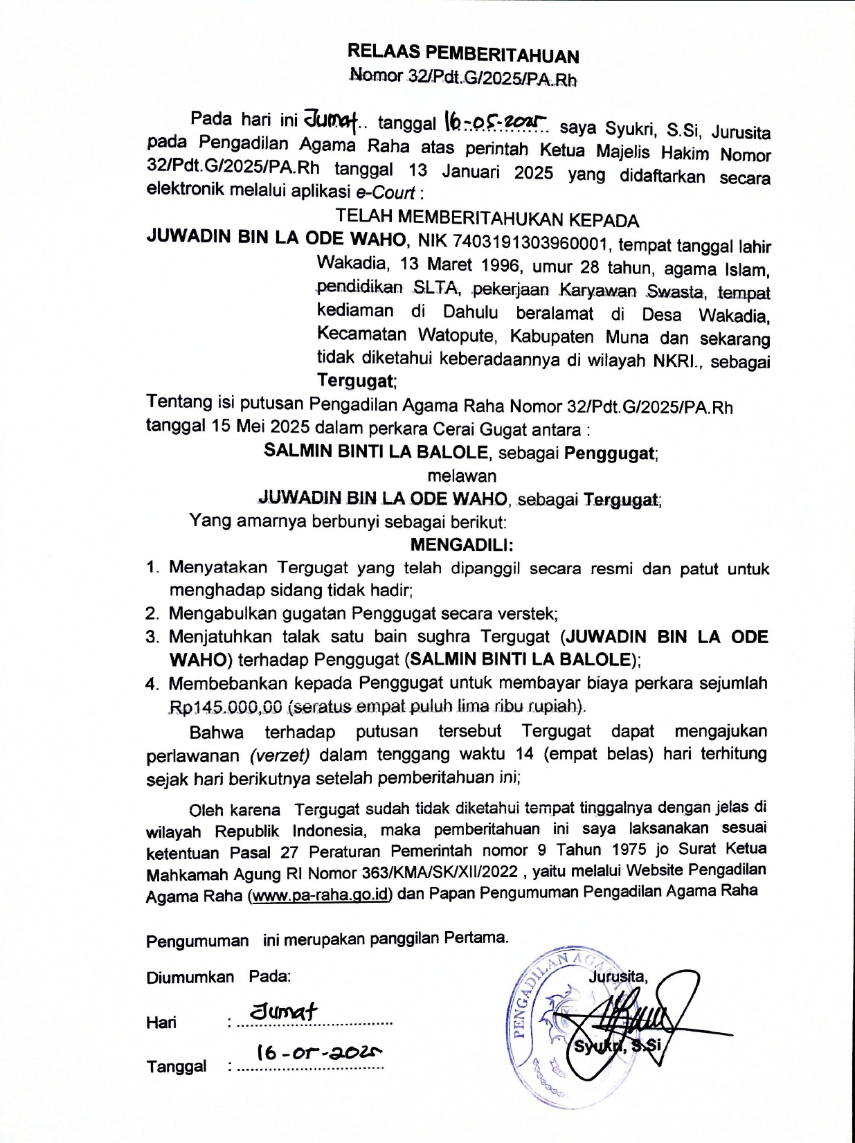Pemberitahuan Putusan Nomor 32/Pdt.G/2025/PA Rh an. Juwadin bin La Ode Waho Written by Super User on 16 May 2025. Written by Super User on 16 May 2025. Hits: 48
