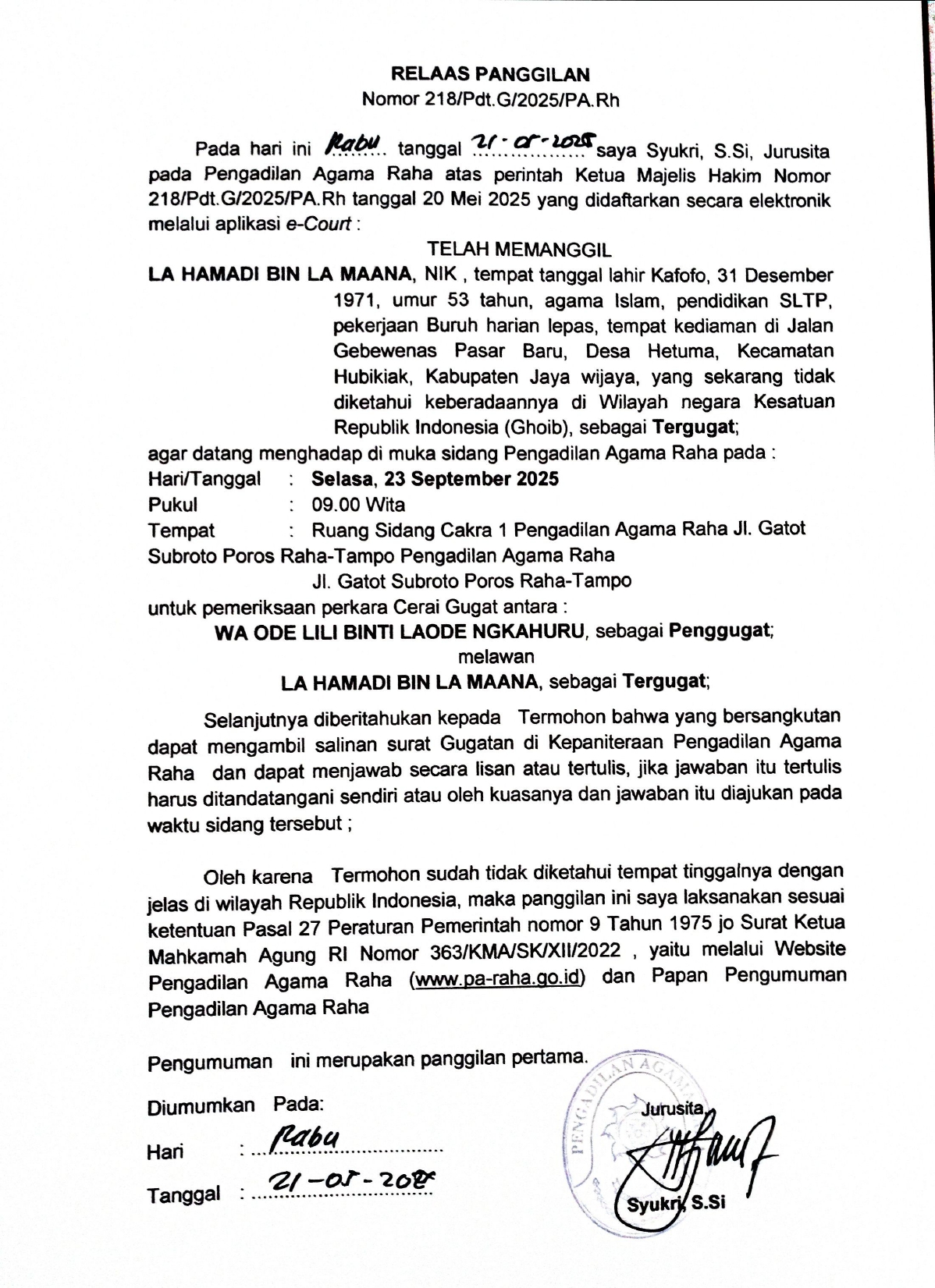 Panggilan Pertama Perkara Gaib Nomor 218/Pdt.G/2025/PA.Rh an. La Hamadi bin La Maana Written by Super User on 21 May 2025. Written by Super User on 21 May 2025. Hits: 99