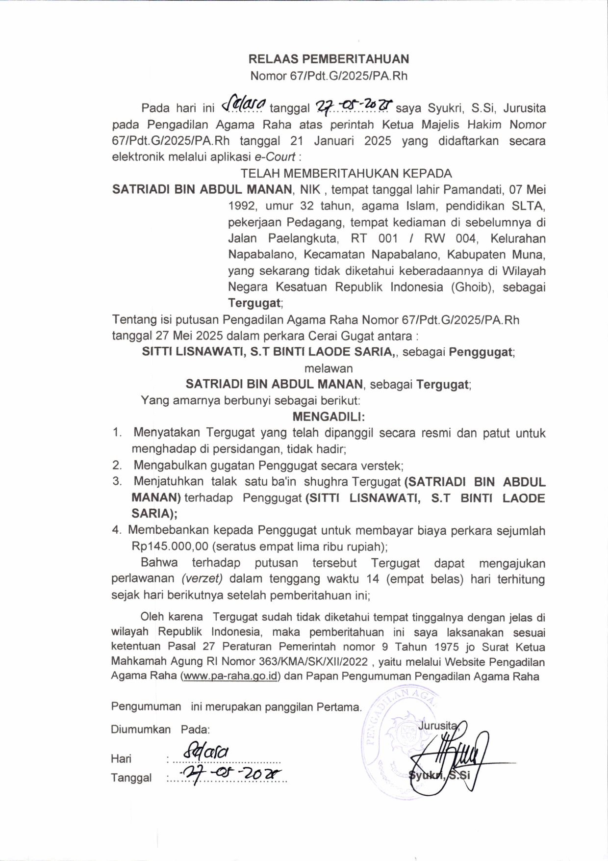 Pemberitahuan Putusan Nomor 67/Pdt.G/2025PA Rh an. Satriadi bin Abdul Manan Written by Super User on 27 May 2025. Written by Super User on 27 May 2025. Hits: 37