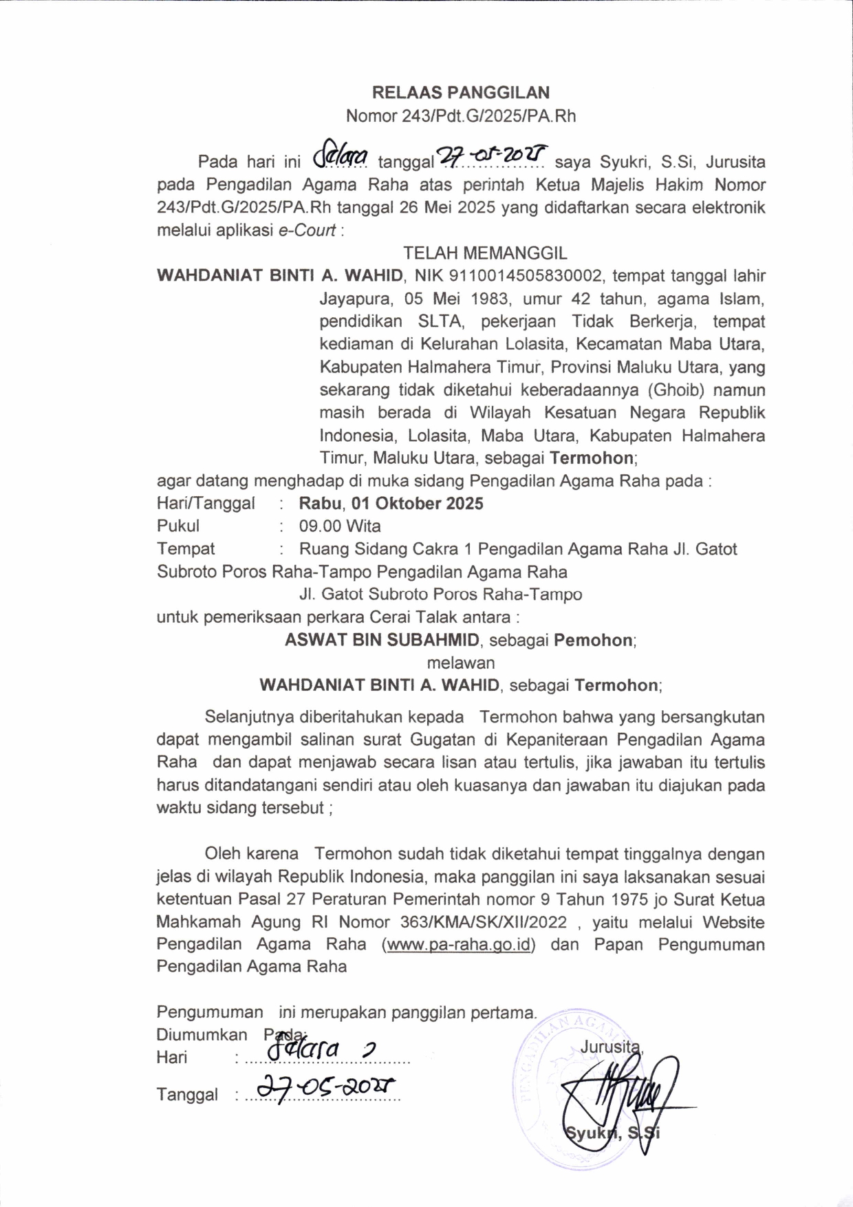 Panggilan Sidang Pertama Termohon, an. Wahdaniat binti A. Wahid perkara Nomort : 243/Pdt.G/2025/PA.Rh Written by Super User on 27 May 2025. Written by Super User on 27 May 2025. Hits: 62
