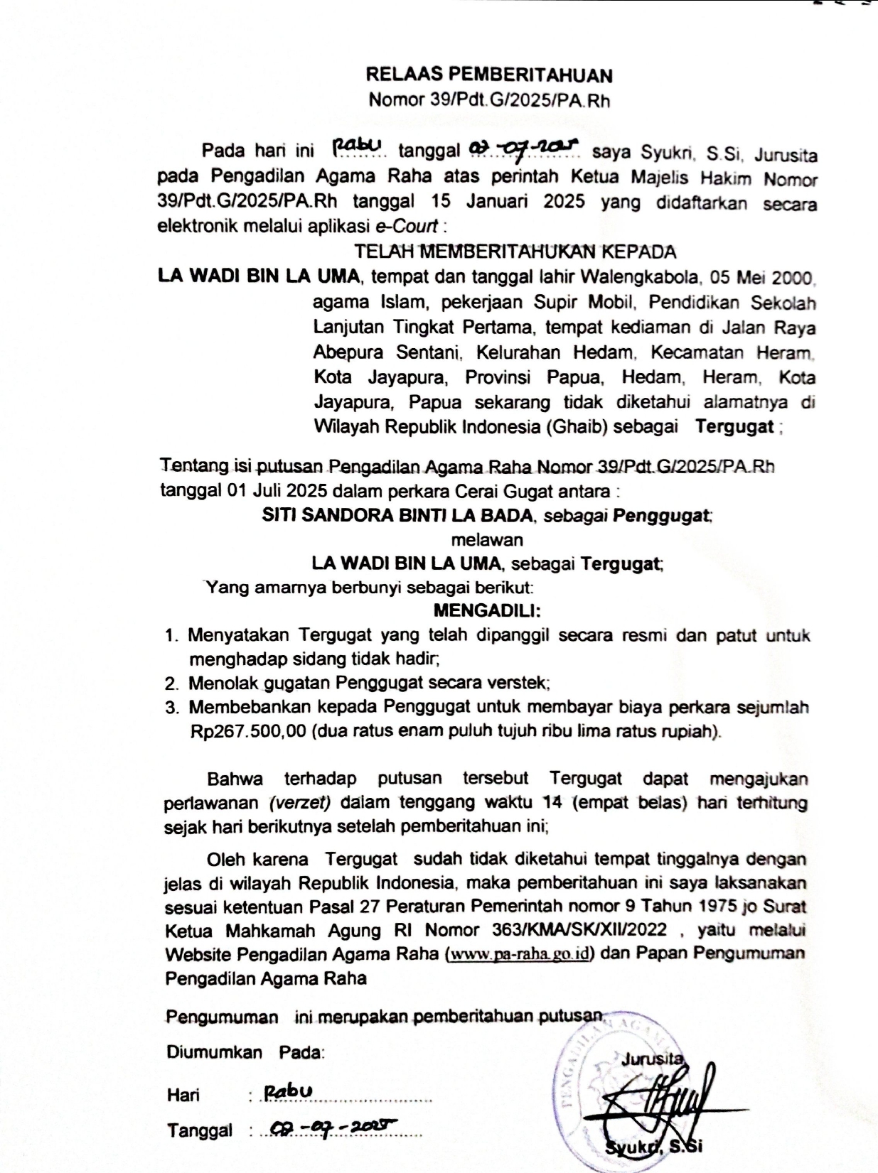 Pemberitahuan Putusan Nomor 39/Pdt.G/2025/PA Rh an. La Wadi bin La Uma Written by Super User on 02 July 2025. Written by Super User on 02 July 2025. Hits: 40
