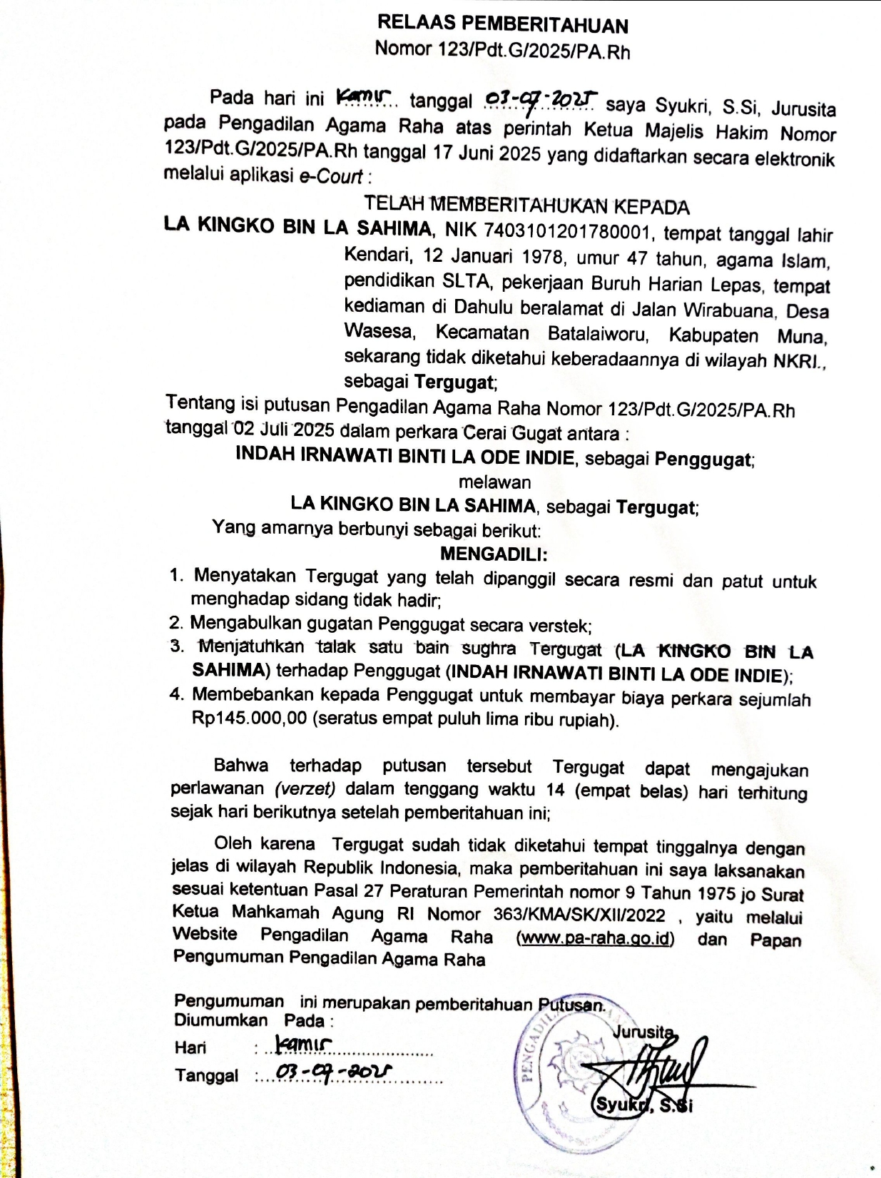 Pemberitahuan Putusan Nomor 123/Pdt.G/2025/PA Rh an. La Kingko bin La Sahima Written by Super User on 03 July 2025. Written by Super User on 03 July 2025. Hits: 45