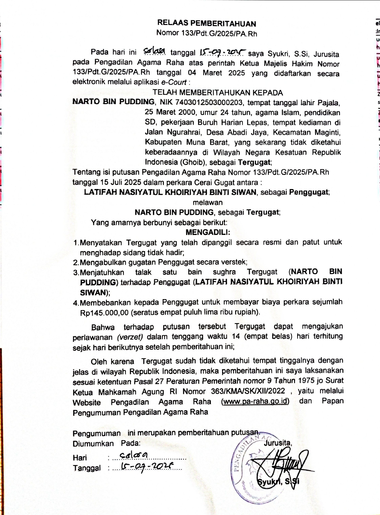 Pemberitahuan Putusan Nomor 133/Pdt.G/2025/PA Rh an. Narto bin Pudding Written by Super User on 15 July 2025. Written by Super User on 15 July 2025. Hits: 55