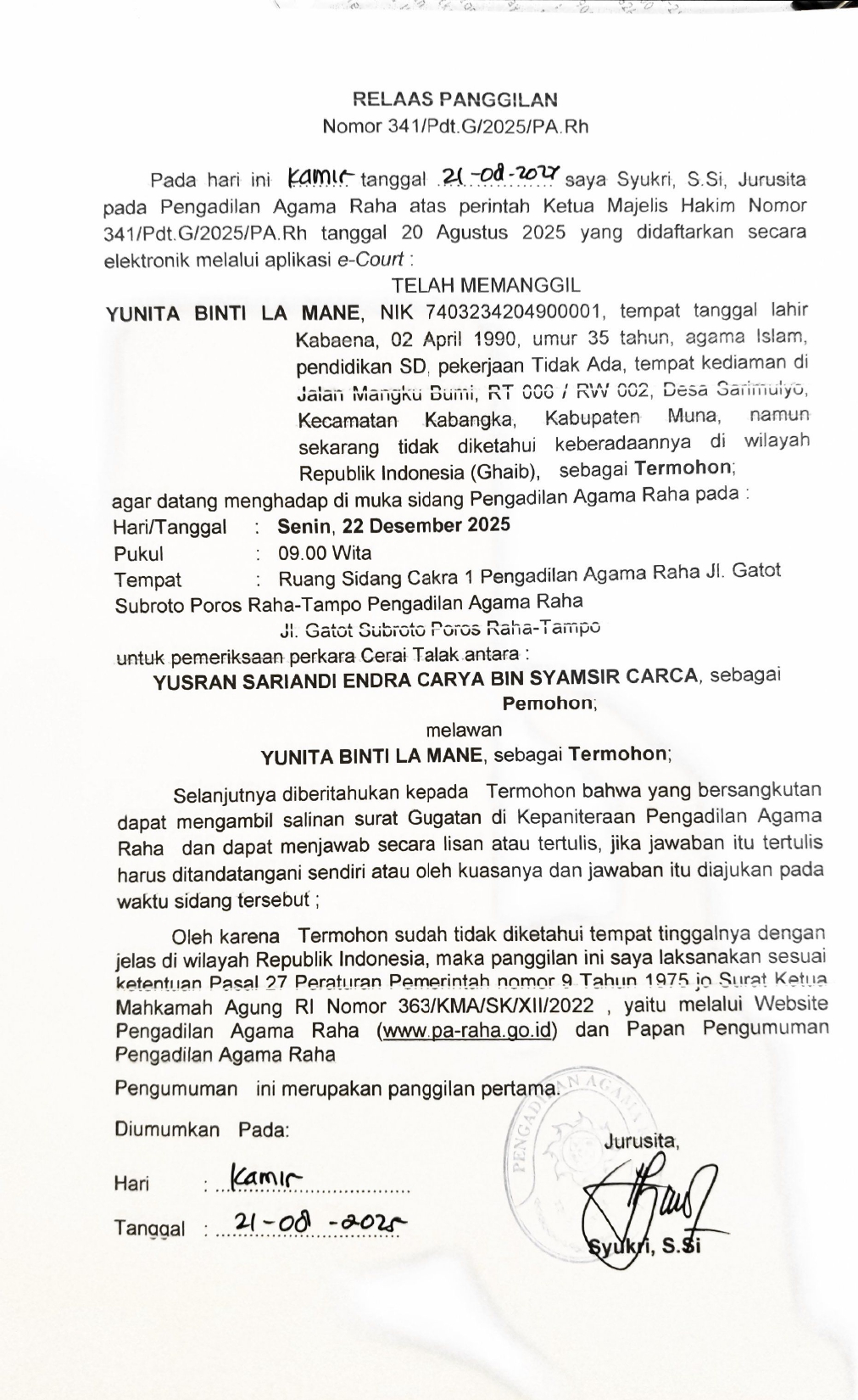 Panggilan Sidang Pertama Termohon an. Yunita binti La Mane Perkara Nomor 341/Pdt.G/2025/PA.Rh Written by Super User on 21 August 2025. Written by Super User on 21 August 2025. Hits: 42