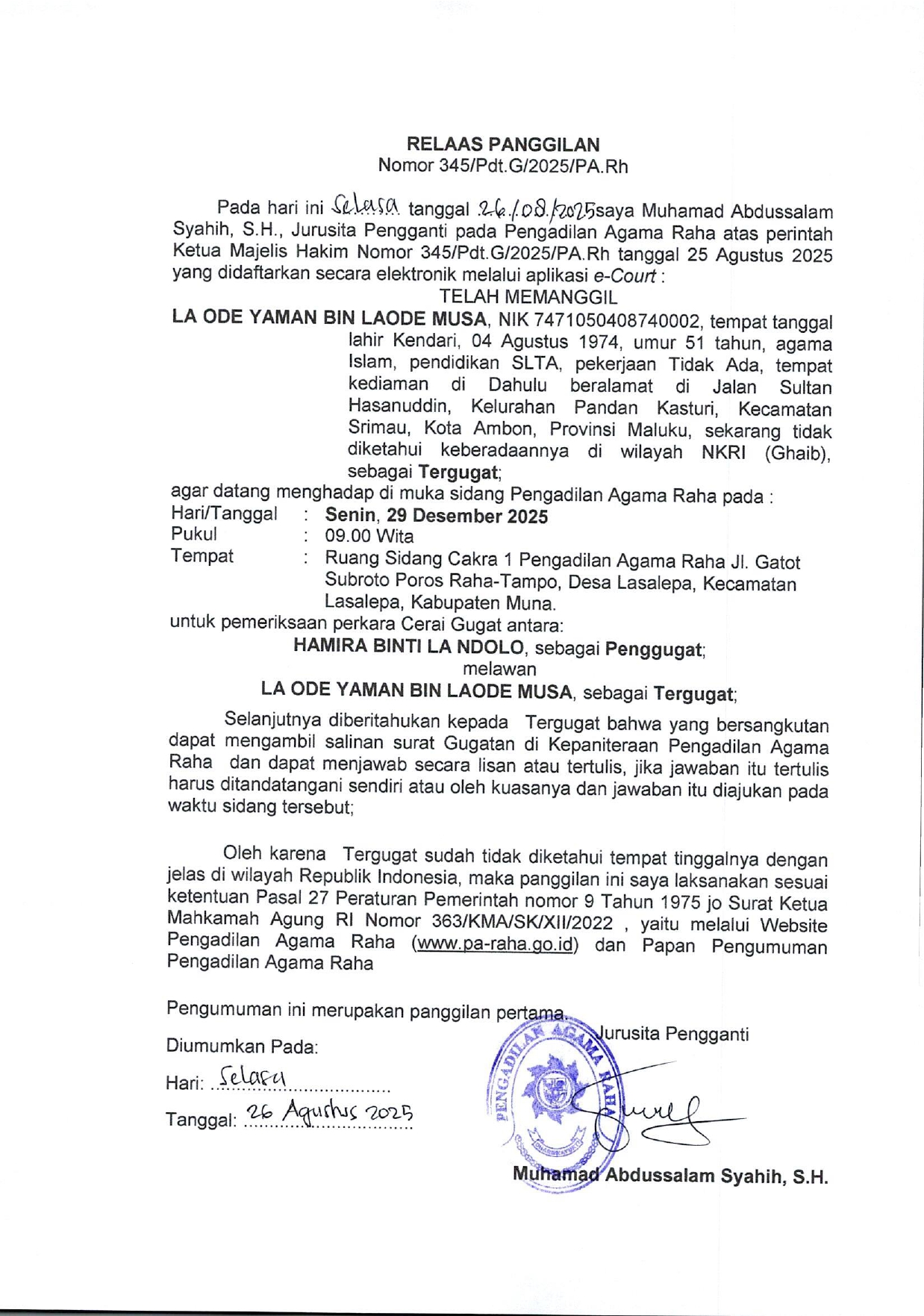 Panggilan Sidang Pertama Terguat an. La Ode Yaman bin Laode Musa Perkara Nomor 345/Pdt.G/2025/PA.Rh Written by Super User on 27 August 2025. Written by Super User on 27 August 2025. Hits: 32