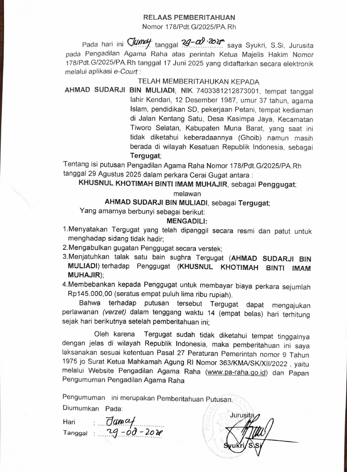 Pemberitahuan Putusan Nomor 178/Pdt.G/2025/PA Rh an. Ahmad Sudarji bin Muliadi Written by Super User on 29 August 2025. Written by Super User on 29 August 2025. Hits: 33