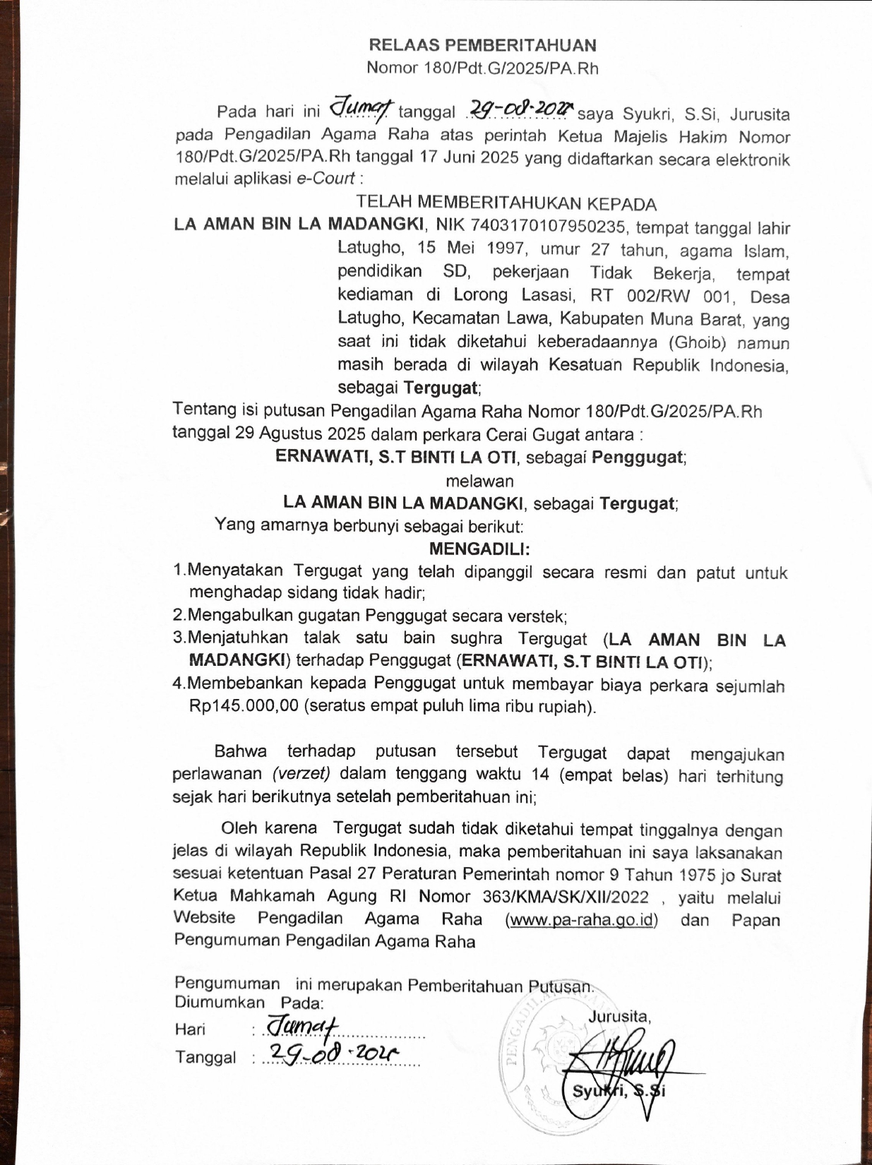 Pemberitahuan Putusan Nomor 180/Pdt.G/2025/PA Rh an. La Aman bin La Madangki Written by Super User on 29 August 2025. Written by Super User on 29 August 2025. Hits: 29