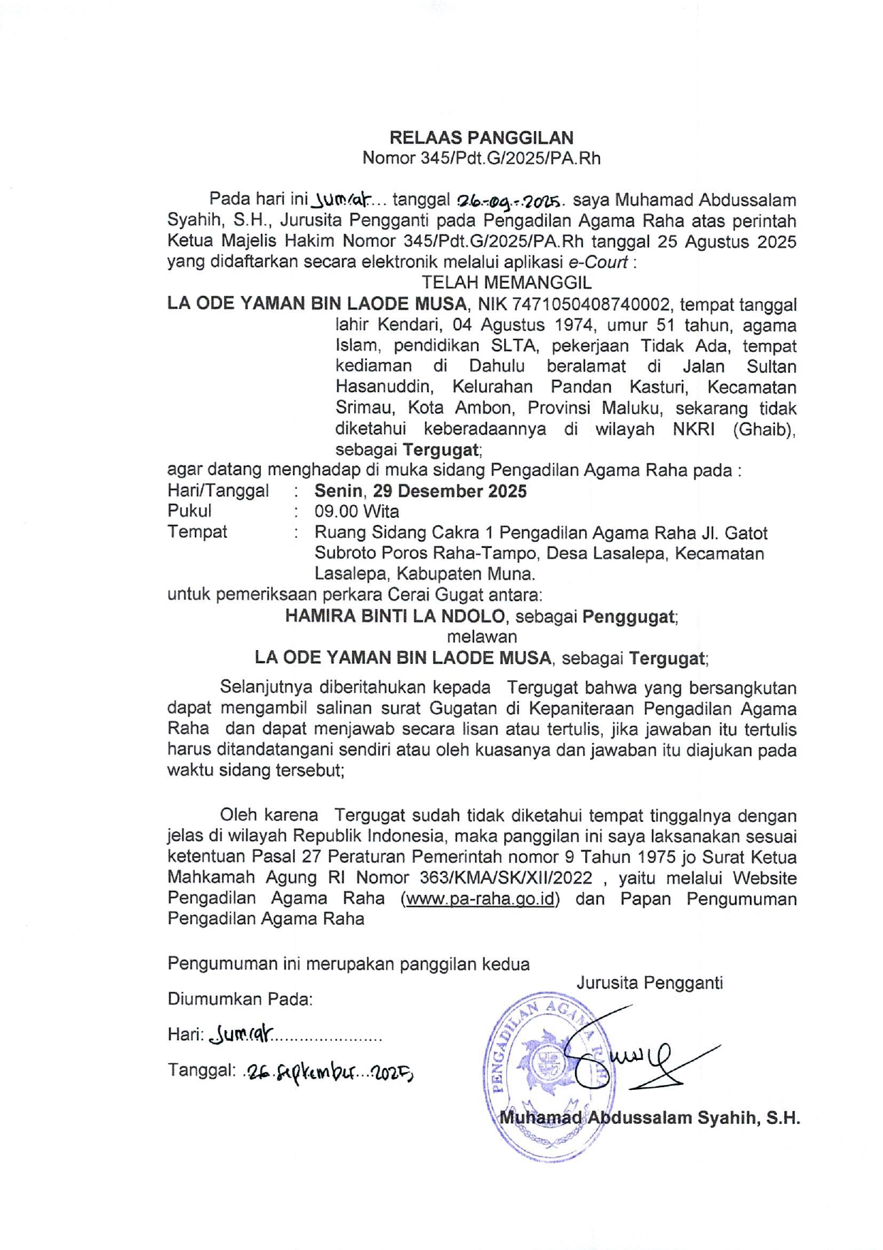 Panggilan Sidang Kedua Terguat an. La Ode Yaman bin La Ode Musa Perkara Nomor 345/Pdt.G/2025/PA.Rh Written by Super User on 26 September 2025. Written by Super User on 26 September 2025. Hits: 14