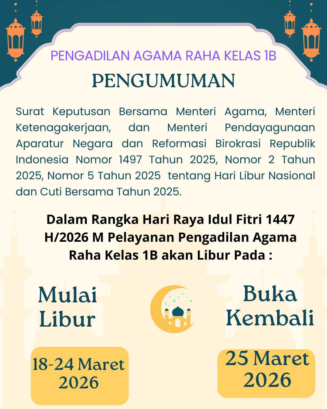 Selamat Datang Di Website Resmi Pengadilan Agama Raha Kelas I B ===== Pengadilan Agama Raha siap memberikan layanan E-COURT (Replik, Duplik, Kesimpulan, Jawaban), Pemanggilan secara online dan Penyampaian salinan putusan secara online ===== Jam Kerja PA Raha Senin -Kamis : 08.00 - 16.30 WITA, Jumat : 07.30 - 16.30 WITA ==