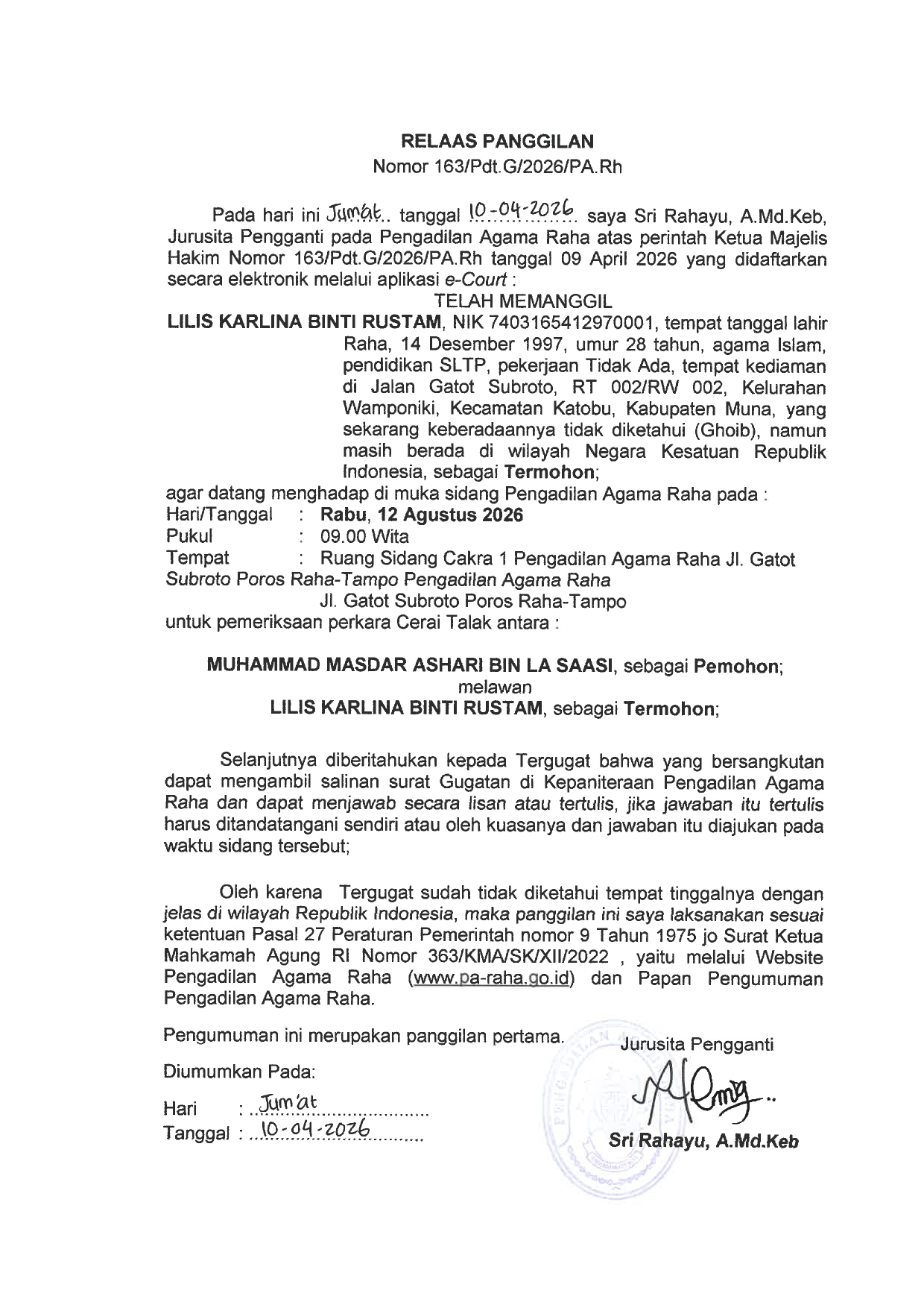Panggilan Pertama Perkara Gaib Nomor 163/Pdt.G/2026/PA.Rh an. Lilis Karlina Binti Rustam Written by Super User on 10 April 2026. Written by Super User on 10 April 2026. Hits: 19