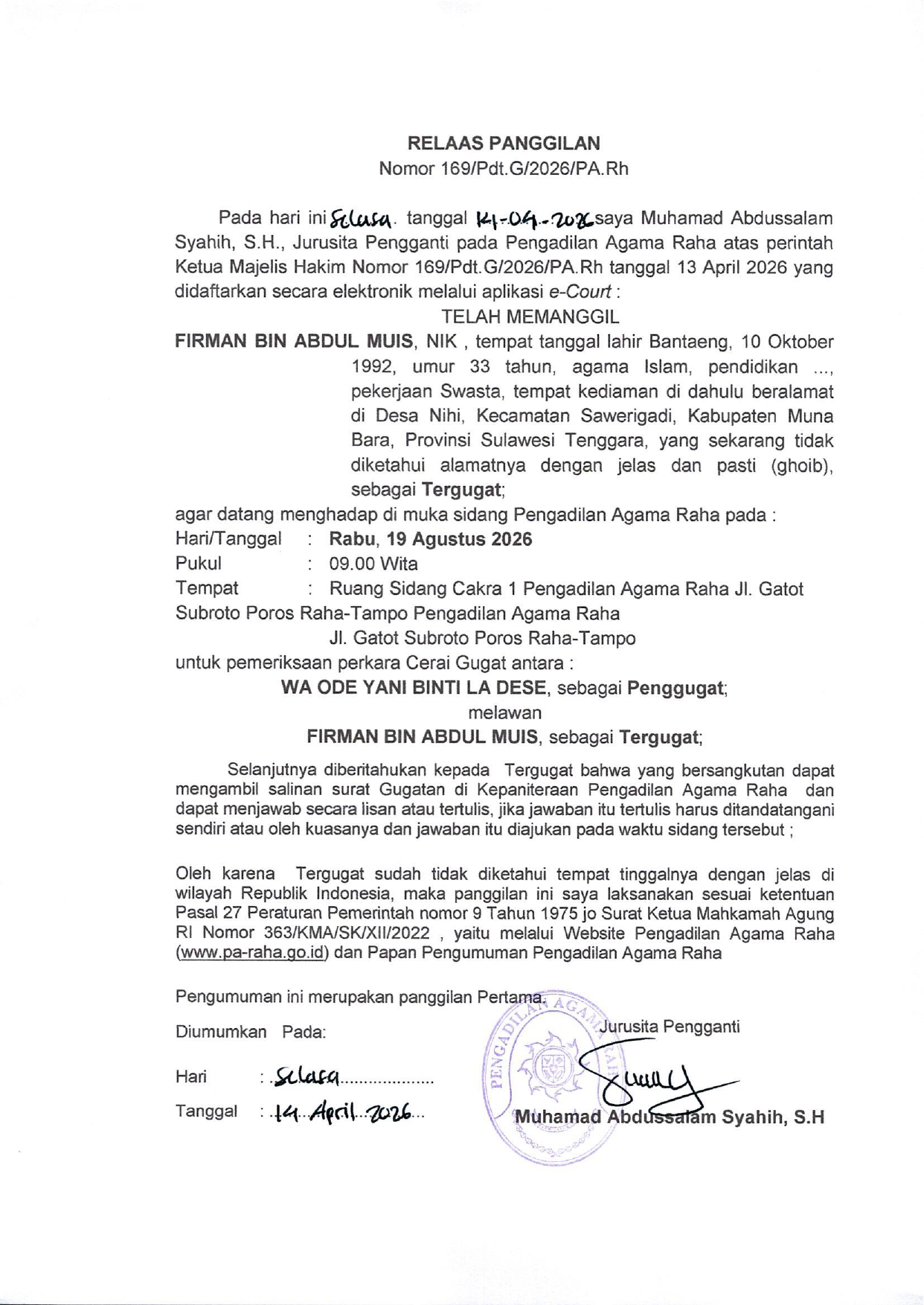 Panggilan Sidang Pertama Perkara Gaib Nomor : 169/Pdt.G/2026/PA. Rh, an. Firman Bin Abdul Muis Written by Super User on 14 April 2026. Written by Super User on 14 April 2026. Hits: 12